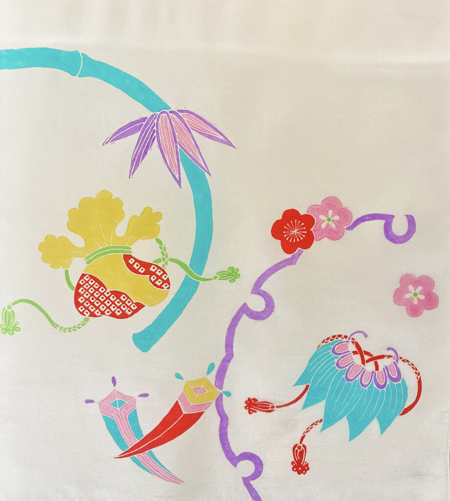 The scarf measures 145cm x 35cm. We offer two patterns: “Bird Sarasa,” a combination of vibrant birds and traditional sarasa patterns, and “Auspicious Symbols,” a combination of traditional treasures and plum and bamboo motifs. Please choose your favorite pattern.